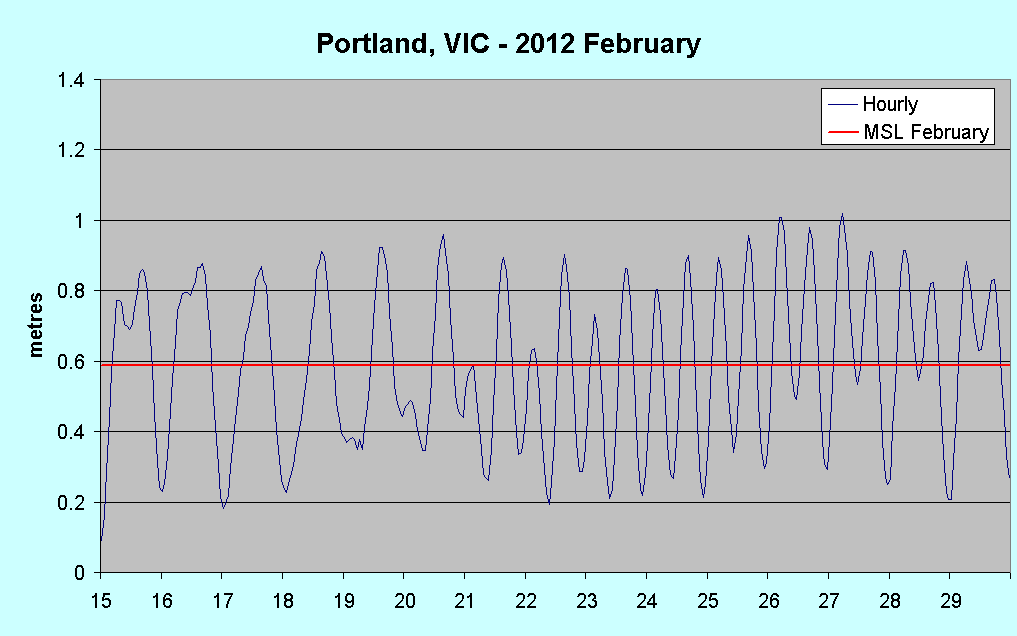 Not that it really matters, as I’ve said, but there are 11 days this month with tidal range OVER 0.7m, not “4 or 5”. I invite anyone to count them. March 1-28th shows 12 days over 0.7m range. Portland VIC exhibits very similar data and tidal characteristics when I compare it with the WillyWeather charts, generally within +/- 5cm on any particular day, and I’ve posted hourly charts for Portland covering 1-14 Feb, split into two periods to show the tides clearly here: